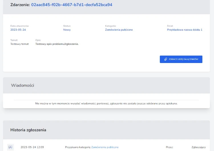 10) Końcowy status zgłoszenia – osoba zgłaszająca widzi ostateczny status zgłoszenia i nie ma możliwości dalszej komunikacji. Zgłoszenie zostaje zarchiwizowane po 12 miesiącach.