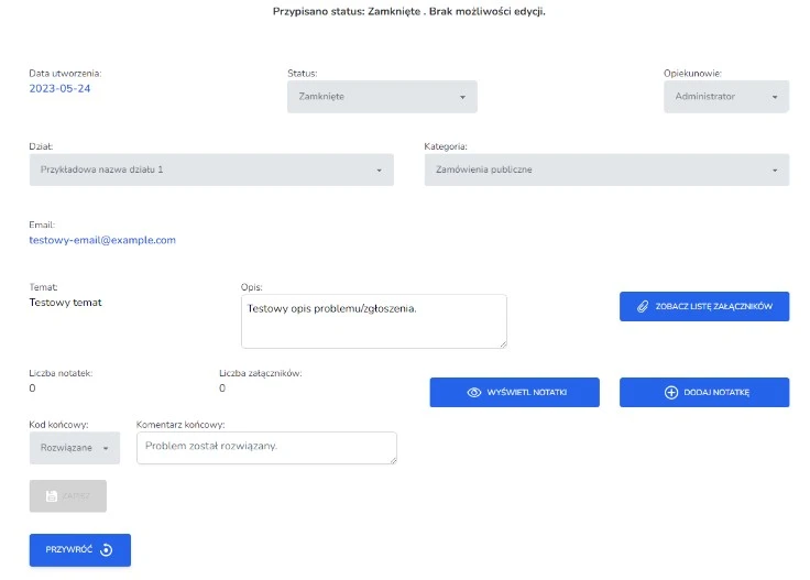 11) Niemożliwość edycji zamkniętego zgłoszenia – po zamknięciu zgłoszenia opiekun nie ma możliwości edycji. Jeżeli jest to konieczne istnieje możliwość przywrócenia zgłoszenia w celu ponownej konwersacji.