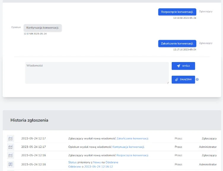 9) Zamknięcie zgłoszenia – po rozwiązaniu problemu opiekun może zamknąć zgłoszenie, co wyłączy możliwość dalszej komunikacji.