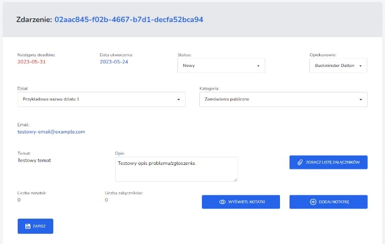 2) Zgłoszenie zdarzenia (uzupełnienie formularza) – po kliknięciu przycisku dodania zgłoszenia, użytkownik zostanie przekierowany do formularza, w którym musi podać odpowiednie informacje dotyczące problemu lub sytuacji, którą chce zgłosić.